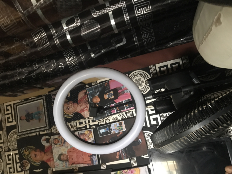 This image presents an indoor scene located in Oba-Ile, Nigeria. The foreground is dominated by a white circular ring light, mounted on a black stand. Behind the ring light, a wall is densely covered with photographs and a black and white geometric Greek key patterned wallpaper. Numerous unframed and framed photographs depict young children in various poses and attire, including one child in a traditional garment and another in a black top with a teddy bear design. A prominent adult female, wearing a headwrap and traditional jewelry, is featured in multiple photographs. To the right, several rolls of black material with silver "GC" brand-like logos and repeating geometric patterns are stacked vertically. In the lower left quadrant, the dusty grill of a black electric fan is partially visible. Additional black stand components are present beneath the ring light's mounting point. A small portion of a light-colored object, possibly upholstery, is visible in the lower right corner.