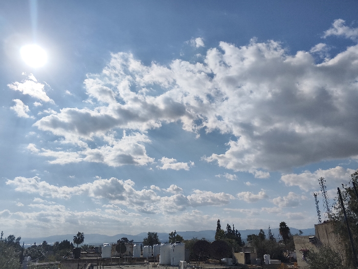 This image captures a daytime scene in the city of الشيخ حسين قرية, Jordan. The sky occupies the upper two-thirds of the frame, featuring a bright, intense sun in the upper left quadrant casting a visible lens flare. The sky is predominantly light blue with scattered white and light grey cumulus clouds of varying sizes. The horizon, visible across the lower portion, shows a distant range of mountains or hills under a hazy atmosphere. In the midground, a collection of white, cylindrical water tanks is prominent, situated on rooftops or elevated structures. Interspersed among these are various types of vegetation, including taller trees resembling conifers or cypresses, and shorter, bushier trees possibly indicative of olive groves. Buildings, primarily single or two-story, with flat roofs, are visible throughout the midground. On the far right, a building or structure is partially visible with multiple tall, slender communication antennae (likely cellular towers) attached or adjacent to it. No individuals or specific actions are discernible within the frame. The scene presents a semi-arid, built-up landscape under partially cloudy conditions.