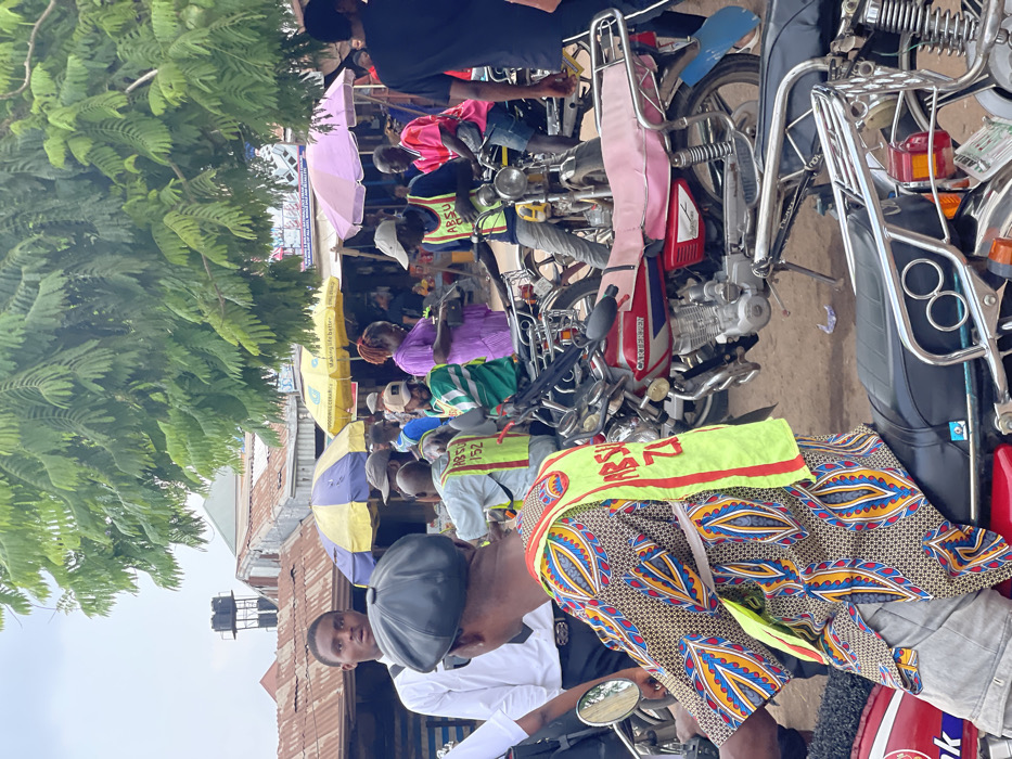 The scene depicts a bustling outdoor environment in Umunekwu, Nigeria, likely a motor park or market area, under an overcast sky