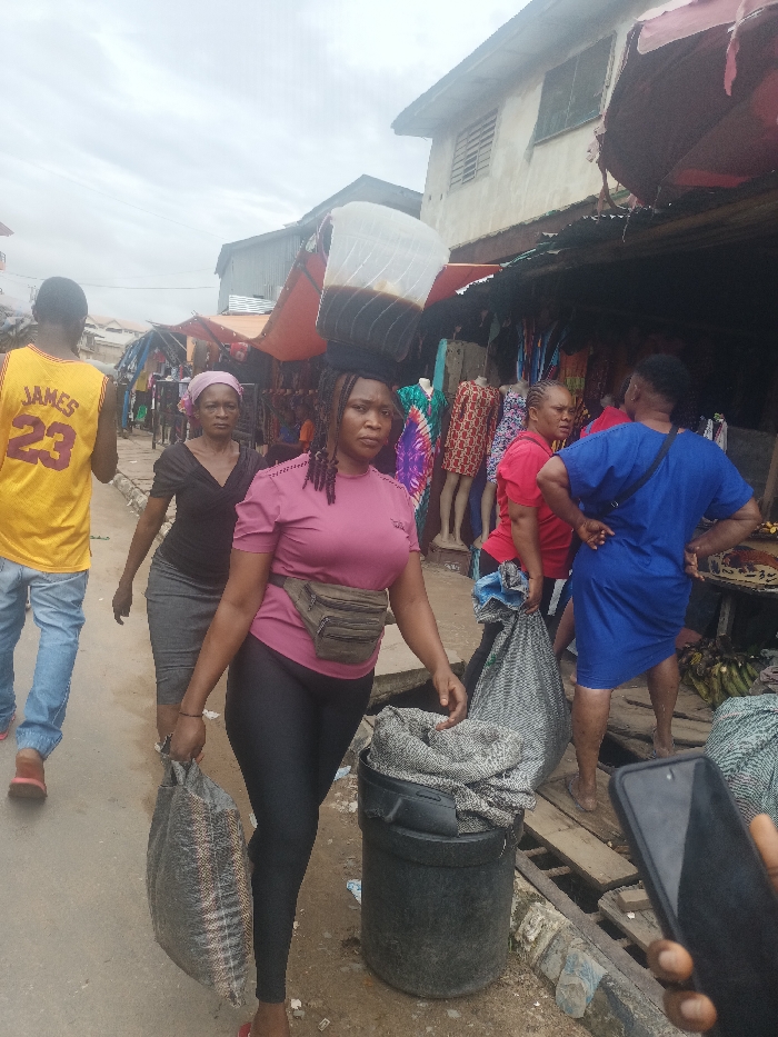 The image depicts a busy outdoor market street in Unguwar Kaya, Nigeria, under an overcast sky. The foreground features a female with braided hair, wearing a pink short-sleeved top, black leggings, and a khaki fanny pack. She balances a large, clear plastic container filled with a dark liquid on her head and carries a grey, textured bag in her left hand while walking forward. Behind her, to the left, a male subject in a yellow "JAMES 23" jersey and blue jeans walks away from the camera. Alongside him, a woman in a dark top and grey skirt, wearing a pink headscarf, also walks. To the right, market stalls are visible with orange tarp awnings, displaying colorful garments on mannequins and bundles of bananas. A woman in a red top holds a large grey bag near a black plastic barrel on the ground. Further right, a woman in a blue dress stands with her hands on her hips, facing the market stalls. A hand holding a black smartphone is partially visible in the lower right foreground. The ground is unpaved and appears to be a dirt path with wooden planks crossing a visible drainage area near the stalls. Weathered concrete buildings are visible behind the market structures.