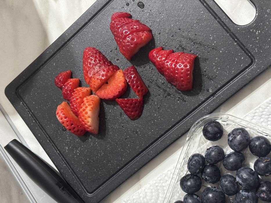 The image displays a domestic kitchen scene featuring fresh fruits in preparation. A dark gray rectangular plastic cutting board occupies the central and right portions of the frame. Scattered across this board are numerous red strawberries, many of which have been sliced or quartered. Small water droplets are visible on the strawberries and the cutting board surface. To the lower left, a clear plastic container (punnet) holds an assortment of whole, dark blue blueberries, resting on a white, textured material, possibly a paper towel or cloth. A black-handled knife or similar kitchen utensil is partially visible on a light-colored surface, positioned above and to the left of the cutting board. The background consists of a uniformly light-colored surface, likely a kitchen countertop. The specific location within Sofia, Bulgaria, cannot be determined from the visual information presented. No individuals are present in the scene.