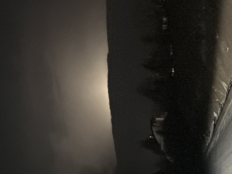The image depicts a nighttime outdoor scene in Sofia, Bulgaria, facing towards Vitosha mountain. A prominent, diffuse light source, likely light pollution from the city, illuminates the underside of a low cloud layer or fog bank, creating a bright orange-yellow glow that extends across the upper portion of the sky, immediately above the dark silhouette of the Vitosha mountain range. The mountain itself appears as a continuous, dark, undulating ridge across the horizon. In the mid-ground and foreground, the environment is predominantly dark. On the left side, a partially visible residential structure, possibly a house, is discernible amidst dark, indistinct tree forms. This structure features a sloped dark roof and lighter-colored walls, with a single, small light source emanating from its upper section. Further to the right in the mid-ground, several faint, distant light sources are visible, consistent with additional buildings or vehicles. The immediate foreground reveals a paved surface, likely a road or path, partially covered by snow or ice, which angles upwards from the lower left towards the center. A distinct line of accumulated snow marks the edge of this surface. No individuals, animals, or specific actions are discernible within the frame. The overall scene is static, captured under low-light conditions with atmospheric illumination.
