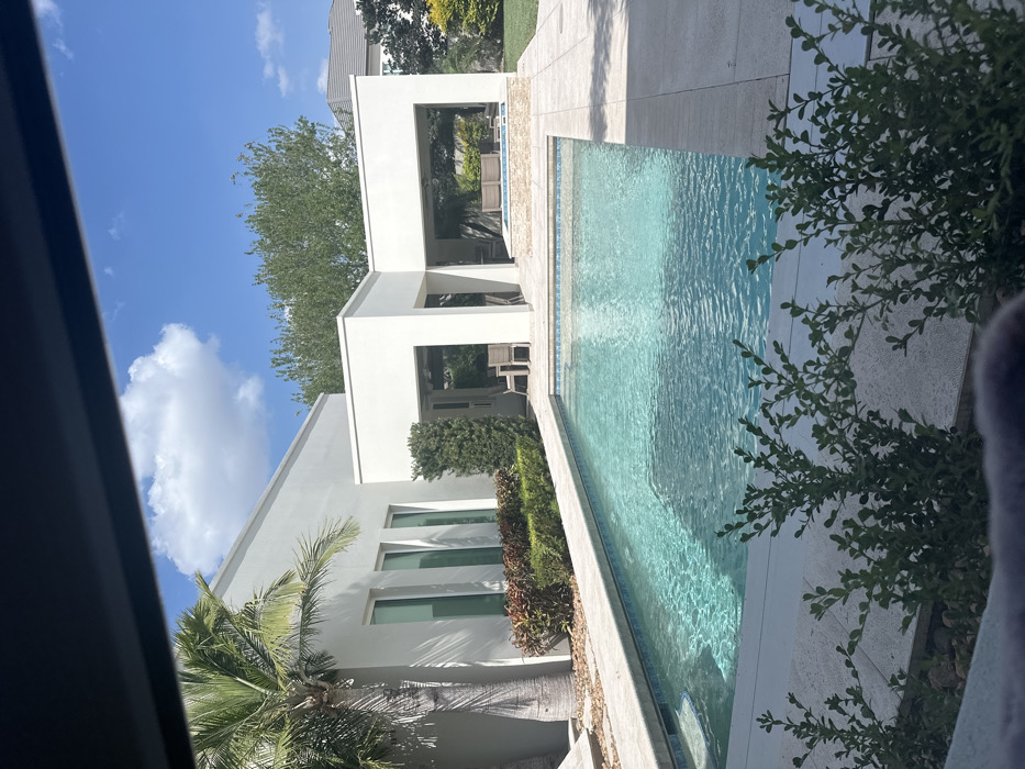 This image depicts a modern residential backyard in McAllen, United States of America, under a bright, sunny sky with scattered white cumulus clouds. A rectangular swimming pool with clear, turquoise-blue water occupies the mid-ground, featuring light blue and dark blue mosaic tiling around its perimeter and light-colored stone coping. Steps are visible on the pool's left side. To the left, a contemporary white stucco building, likely a house, exhibits a flat roofline and several tall, vertical, dark-framed windows. A large palm tree stands prominently beside this structure, with a landscaped bed containing red and green foliage and neatly trimmed green hedges along its base. In the center-right, a series of connected, open-air white stucco structures with flat roofs form covered patio areas. One section houses a light-colored outdoor dining table with four chairs. A further section contains lounge furniture and an elevated, tiled spa or small pool. Light-colored paving stones form the deck around the pool and extend to these structures. Green grass lawns and various trees are visible in the background. The immediate foreground is partially obscured by out-of-focus green leafy bushes and an indistinct dark object at the very bottom of the frame. The scene is devoid of any individuals, actions, or interactions.