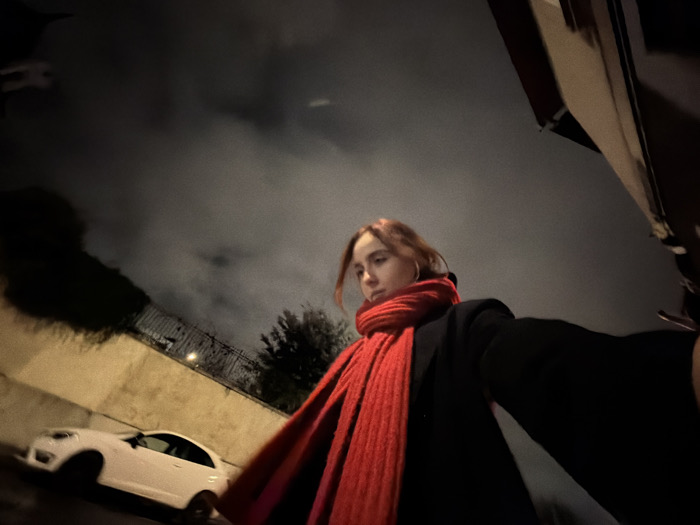 A young woman with reddish-brown hair poses for a selfie at night. She wears a black coat and a large red scarf. Behind her is a white car parked on the street. The sky is cloudy and dark. A retaining wall with a metal fence runs along the street. A building corner is visible on the right. The image is taken at a low angle, highlighting the woman's face and the dramatic sky.