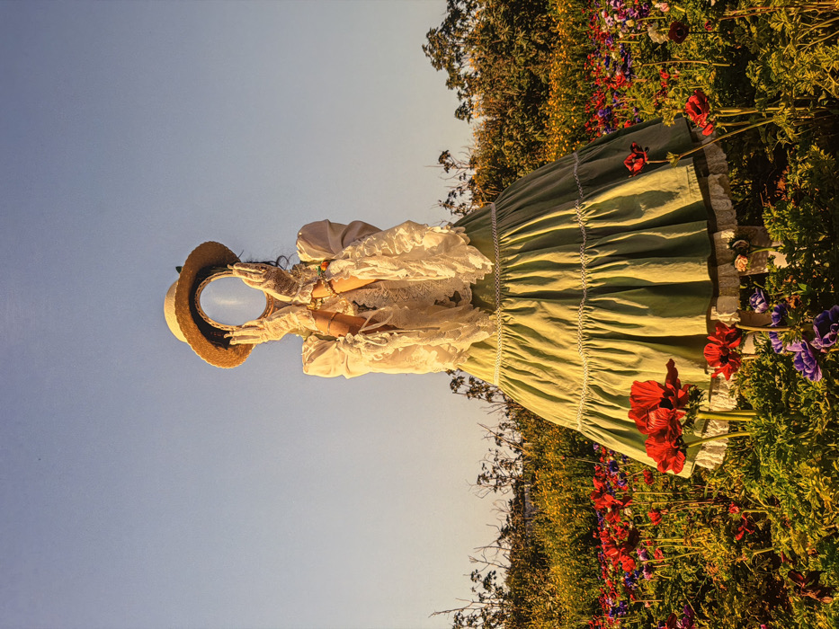 A person is depicted standing upright, centrally positioned in a vibrant field of blooming flowers under a clear, warm-toned sky. The individual, dressed in period-style attire, wears a wide-brimmed straw hat, a white long-sleeved blouse with elaborate lace detailing and ruffled cuffs, long white lace gloves, and a voluminous light green tiered skirt with a white lace trim. Their face is completely obscured by an oval-shaped mirror held by both gloved hands, which reflects the blue sky. Bracelets are visible on the right wrist. The foreground and midground are densely covered with red and purple anemones, interspersed with green foliage and other colorful blossoms. Taller, darker shrubs and plants form a natural backdrop at the edge of the field. The scene is illuminated by warm, natural light, indicative of late afternoon or early morning. The setting is a natural, unbuilt flower field located in or on the outskirts of Tel-Aviv, Israel.