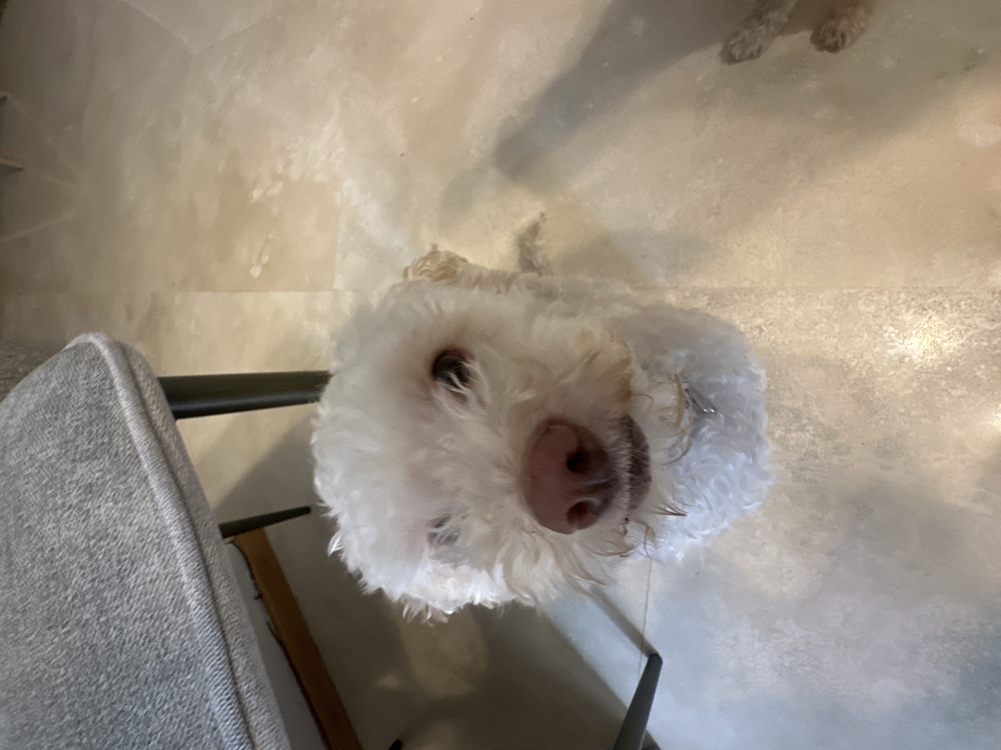 A white dog with a pink nose is looking up at the camera. The dog is positioned on a light-colored tiled floor next to a chair with gray fabric upholstery and a black metal frame. The location of the photo is unknown, and no information suggests the setting is in Mexico City, Mexico.