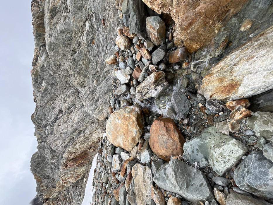 A close-up shot of a rocky terrain, possibly a mountain slope. Large gray and brown rocks intermix with smaller pebbles and gravel. The rough, layered texture of the rock face is visible on the left. Traces of snow linger among the rocks at the bottom. A thin stream of water trickles down the center, creating a glossy effect on the surrounding stones. The scene evokes a sense of ruggedness and natural beauty.