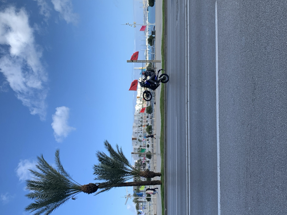 This image captures a daytime scene along the Corniche (waterfront promenade) of Tangier, Morocco, identifiable by the numerous Moroccan flags (red with a green star and pentagram) displayed throughout the background. In the immediate foreground, a multi-lane asphalt road with distinct white lane markings (a double solid line and a single solid line) stretches horizontally across the frame. On this road, slightly right of center, a person on a dark blue and black motorcycle is performing a wheelie, with the front wheel elevated high off the ground. The rider is wearing a dark jacket and a light-colored helmet. Behind the road, a paved pedestrian promenade is visible, featuring several tall palm trees, primarily on the left side. Multiple pedestrians are walking along this promenade. Beyond the promenade, a series of modern, white buildings line the waterfront. Numerous Moroccan flags are prominently displayed on poles along the promenade and in front of the buildings. Further back, a marina with blue water contains multiple docked boats and yachts. The sky is clear blue with scattered white clouds. The scene is illuminated by bright daylight.
