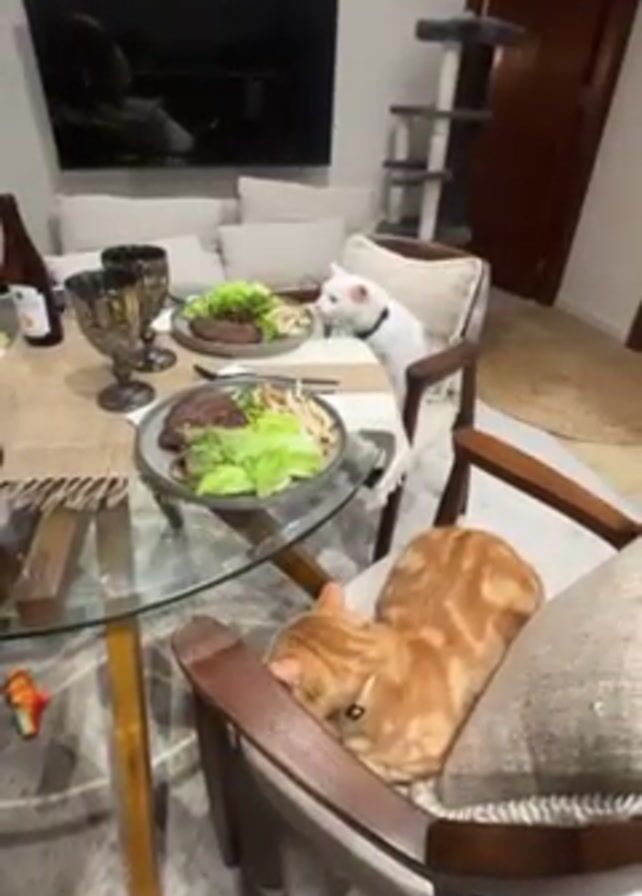 A white cat wearing a black collar sits at a dining table looking at a plate of food. The plate contains a steak, french fries, and a salad. An orange cat rests on a chair to the side. A second plate of the same food is set on the table in front of a second chair. A television screen is visible in the background, along with a cat tree. The table has a glass top. The person recording the video asks the cat, "What, fat boy? Are you living your best life?"