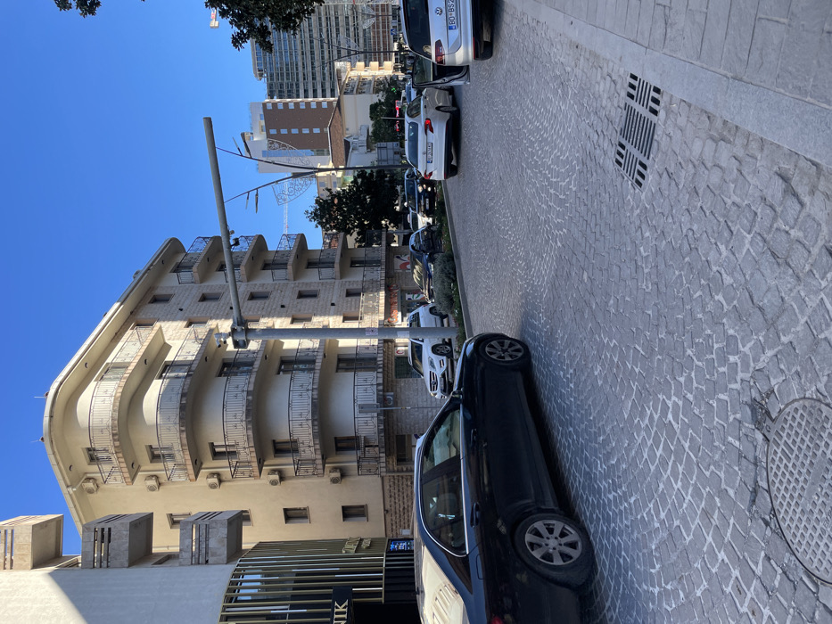 This image depicts a sunny urban street scene on Mediteranska Street in Budva, Montenegro, looking generally southeast towards the city center. The foreground features a cobblestone road with a circular pattern of paving stones. A dark-colored sedan, possibly a Mercedes-Benz, is positioned on the left, facing away from the viewer. To its right, partially visible, is the rear of a white Volkswagen, likely a Golf variant, with its rear passenger door open. Further down the street, a white sedan and a white Mercedes-Benz GLK-Class SUV are visible among other vehicles. On the left, a modern building with vertical metallic fins is partially visible, displaying the letters "NIK" from a sign. Across the street on the right, a prominent multi-story building with a light-colored, stone-clad facade stands. This building features multiple rounded balconies with ornate dark metal railings, and several external air conditioning units are mounted on its exterior walls. The street is lined with low green landscaping. A tall, light-colored street pole with a horizontal arm extends over the road, supporting what appears to be a camera or sensor. Another decorative street light with a leaflike design is visible further down the street. In the mid-distance and background, a mix of other urban buildings, some with modern glass facades, and a construction crane are discernible under a clear blue sky. No individuals are clearly visible.