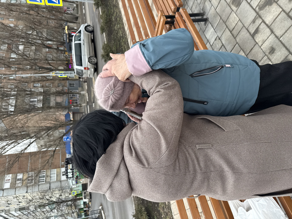 The image captures two women on a paved sidewalk in Makiivka, Ukraine, under an overcast sky