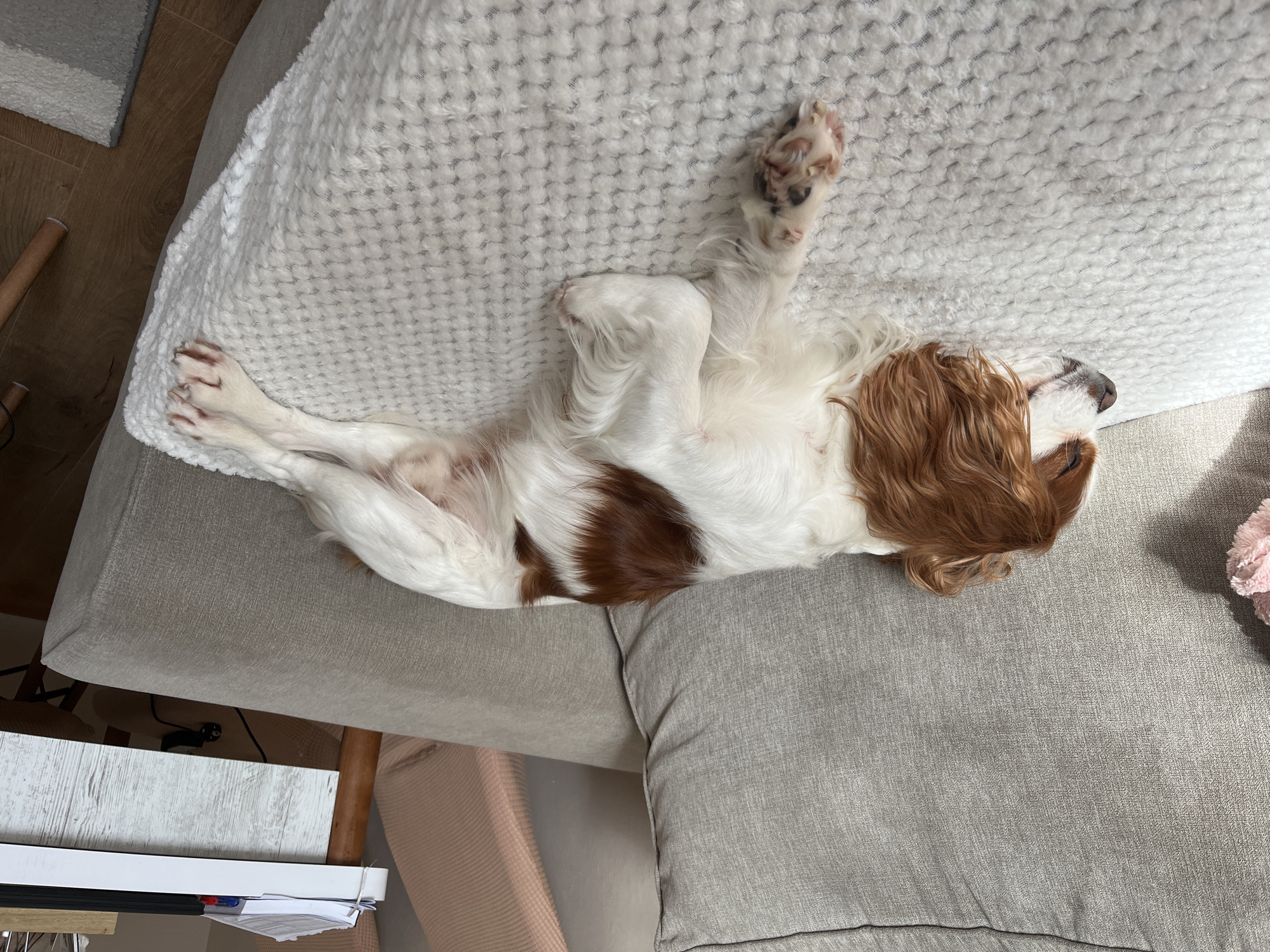 An interior scene in Tsarevo, Bulgaria, displays a Blenheim Cavalier King Charles Spaniel dog resting on a light gray fabric sofa. The dog is lying on its left side, extended across a white, textured blanket that covers part of the sofa. Its head is turned to the left, eyes closed, with distinctive chestnut-colored fur on its head and patches of chestnut on its white body. A pink, soft-textured object is partially visible to the left of the dog's head. In the background, behind the sofa, a light-colored upholstered chair and a white and wood-toned desk are present. On the desk, a stack of papers, a blue pen, and a red pen are visible. A black electrical plug and cable are visible on the floor beneath the desk. The visible flooring is a wood-patterned laminate or hardwood, with a section of a gray and white patterned rug in the lower right corner.