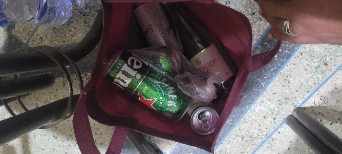 An overhead view reveals a maroon-colored tote bag situated on a light-colored, speckled floor featuring two parallel light blue lines. Inside the bag are two green Heineken beer cans, one opened silver aluminum beverage can, one glass bottle labeled "Perrouane Rose," one silver aerosol can, and a small, clear plastic bag containing an unidentifiable item. In the upper left background, dark, tubular metal furniture legs with visible rust and two circular metal rings are present. A clear plastic water bottle with a blue cap is visible in the upper right background. A human hand, bearing a silver ring on the ring finger, is partially visible in the bottom right, adjacent to the bag. The scene is located in Dkhissa, Morocco.