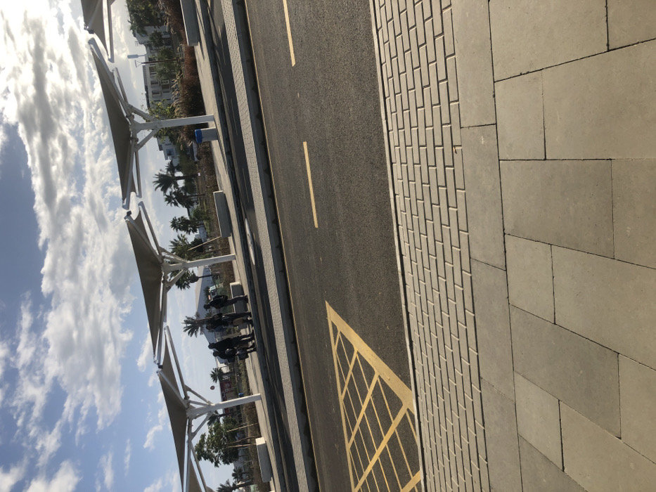 An outdoor scene presents a road marked with yellow lines and a yellow grid pattern at the bottom. The road is flanked by sidewalks featuring a pattern of rectangular bricks and large, flat paving stones. On the left, a series of white, shade structures with pointed roofs are visible, casting shadows on a group of silhouetted individuals. Palm trees and buildings are visible in the background, with a sky filled with white clouds above.