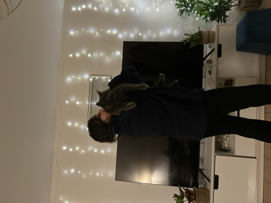 A woman in dark clothing is hugging a grey cat. The cat is on her shoulder with its front paws draped over her upper back. The woman is facing towards the left of the image. Behind them is a black flat screen TV against a white wall with string lights. Some furniture and plants are partially visible in the background.