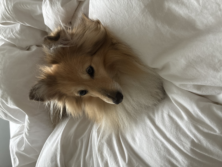 - "The image depicts a Shetland Sheepdog, exhibiting light brown and white coloration, resting on a bed in a room located in Lisbon, Portugal" by FM-dxbXj1, licensed under CC BY 4.0