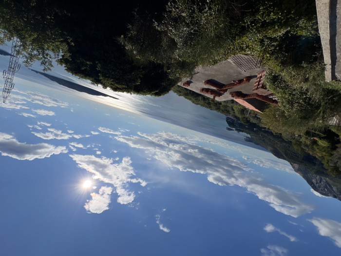 This image depicts a high-angle landscape view of a coastal area in Podbadac, Montenegro, under a clear blue sky with scattered white cumulus clouds. The sun, prominently positioned in the upper right, casts a bright glare and creates a reflective, sunlit path across the calm, blue-green sea that dominates the center and right portions of the frame. A distant, elongated island or peninsula is visible on the horizon. On the left, a steep, densely vegetated mountain range descends towards the coastline, where small structures are visible along the water's edge. In the midground, a flat, concrete construction platform is visible, containing multiple stacks of red-orange bricks and partially constructed brick formations. Dense green foliage and bushes occupy the foreground, with a concrete path edge present in the lower-left. A tall, metal lattice power transmission pylon stands vertically on the far right, partially obscured by vegetation. No individuals or specific actions are depicted.