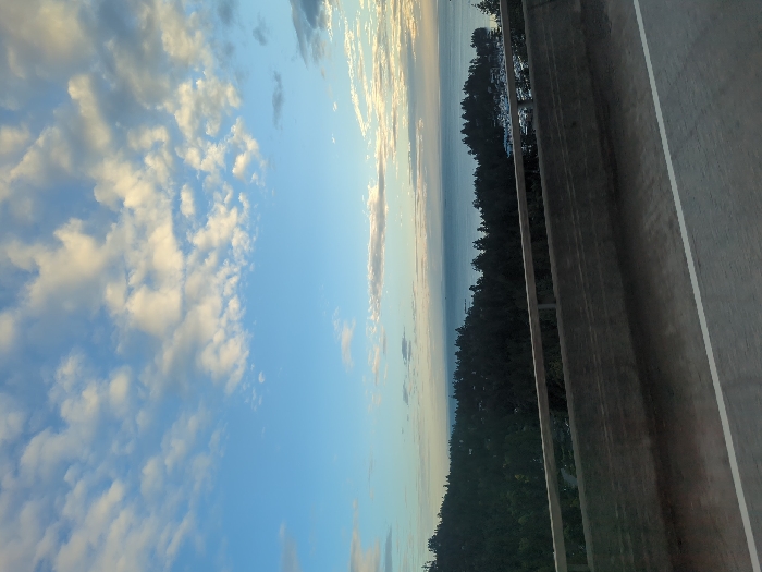 The image presents a panoramic coastal landscape viewed from an elevated position, likely a highway. In the foreground, the upper edge of an asphalt road surface with a solid white line is visible on the lower right. A concrete retaining barrier, topped with a gray horizontal railing, spans the lower third of the image, separating the road from the distant view. Beyond the barrier, a dense expanse of dark green coniferous forest covers a sloping terrain. In the midground, a large body of water, indicative of the Pacific Ocean or Georgia Strait, stretches horizontally. To the right, partially obscured by trees at the shoreline, a marina contains numerous white-hulled recreational boats docked. The background features a clear blue sky dotted with scattered white cumulus clouds, some illuminated by golden light. No individuals or specific actions are depicted. The scene is consistent with a viewpoint from the Trans-Canada Highway (Highway 1) in West Vancouver, Canada, overlooking the coastline and a marina, possibly near Eagle Harbour or Horseshoe Bay.