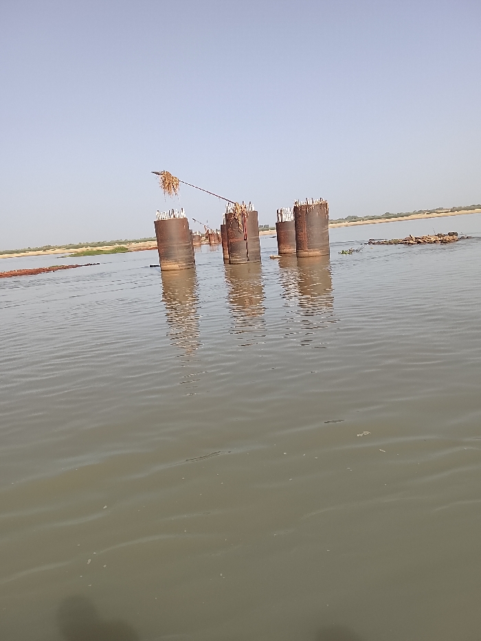The image depicts a wide, murky, greenish-brown body of water under a clear, pale blue sky. In the mid-ground, a series of at least eight large, rusty-brown cylindrical metal structures, likely caissons or coffer dams, are partially submerged, extending above the water surface. Reinforcing bars (rebar) protrude from the tops of several cylinders, indicating ongoing or abandoned concrete work. Accumulated organic debris, appearing as dried vegetation, is draped over the tops of some cylinders, and a cable or rope similarly laden with debris is suspended between two of these structures. Clusters of floating aquatic vegetation and dark, possibly wooden, debris are visible on the water surface. A distant, low-lying riverbank with sparse, dry-looking vegetation forms the horizon. No individuals are present. The scene is located in Ibi, Nigeria, consistent with a riverine environment.