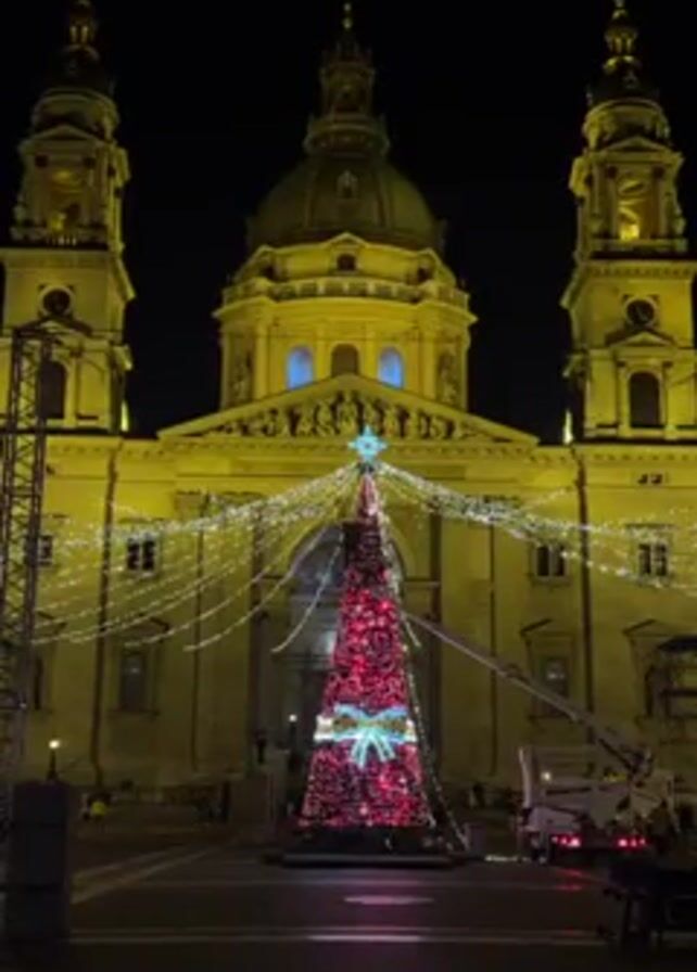 At night, a large Christmas tree stands in front of a brightly lit church. Strings of white lights stretch from the church to the top of the tree. A boom lift is parked on the right side of the tree. Some construction equipment is to the left of the tree.