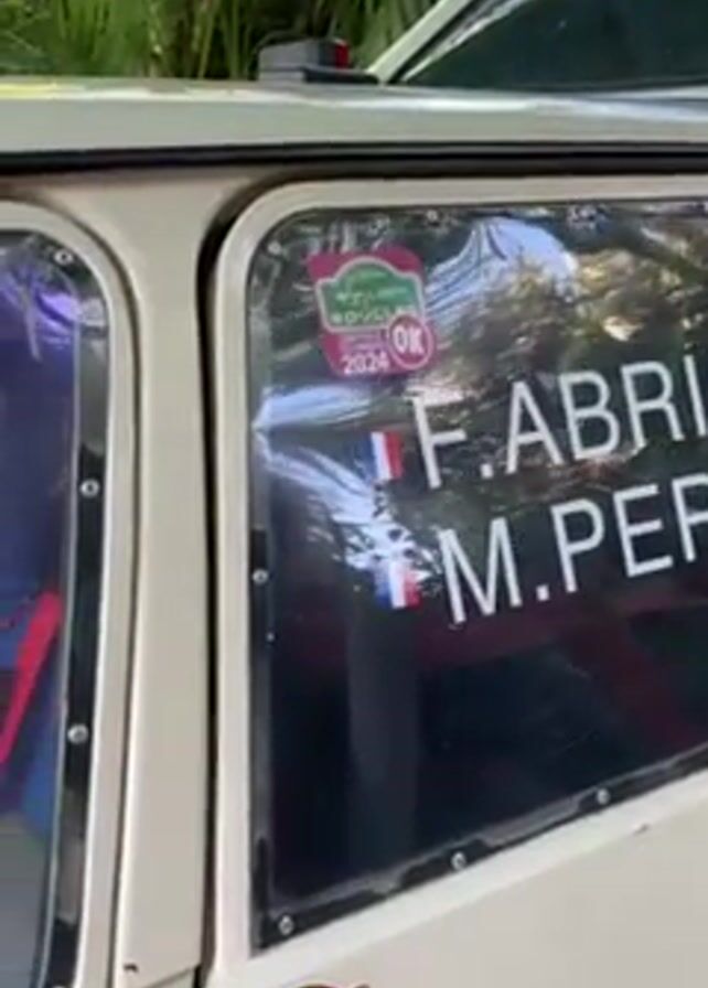 side of a white vehicle with "F. ABRIAL" and "M. PERIN" displayed in white lettering on the window. Small French flags are next to each name. Stickers for "Boucle De Cayenne" 2024 and "Verificado" are also on the window. The vehicle appears to be outdoors with green foliage visible in the background. The engine is idling and producing a rhythmic sound.