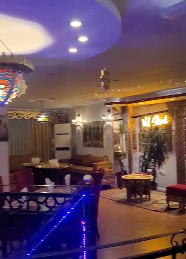 interior of a restaurant with Moroccan-style decor. There are multiple seating areas with tables and chairs, as well as cushioned seating arrangements. The lighting includes overhead spotlights, colorful hanging lanterns, and decorative wall sconces. The restaurant has a two-level layout, with a railing separating the upper and lower sections, decorated with a geometric pattern and strung with colorful lights. The color scheme is warm, with earth tones and accents of red and gold. A neon sign with the word "guest" in Arabic script can be seen in the background.