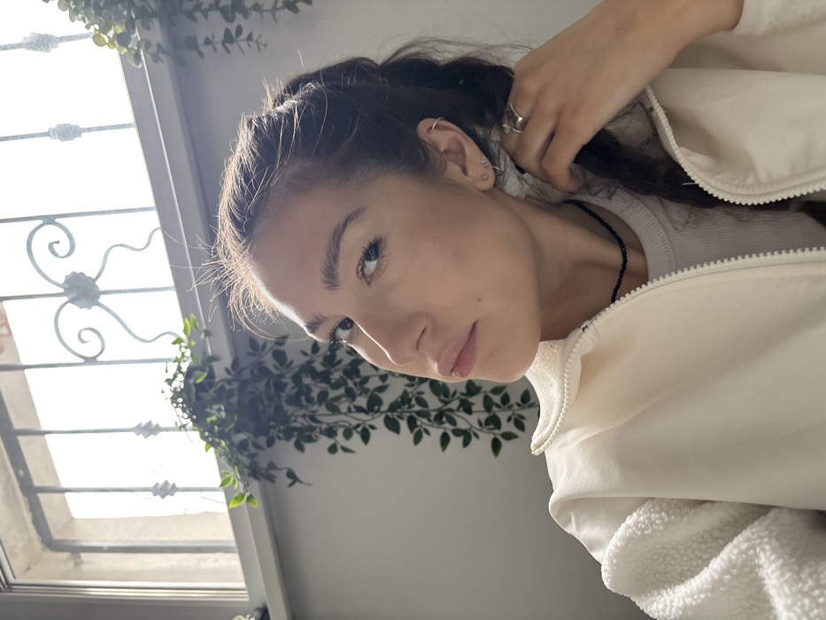 This image depicts a female individual indoors, in the city of Kazan, Russia. The subject, an adult female, is shown from the chest up, facing partially left with her gaze directed towards the camera. She has pulled-back dark hair, dark eyebrows, and a neutral facial expression with subtly enhanced eyelashes. She wears a cream-colored zip-up jacket with textured fleece sleeves and a white ribbed top beneath. A thin black choker necklace is visible. Her visible right ear features two small stud earrings and one cuff earring. A ring is present on her right ring finger. Her right hand is positioned near the side of her head, at the nape of her neck, with her thumb visible. The background includes a window with white frames and decorative black wrought-iron security bars featuring a central scrolled design. Bright natural light emanates from the window. Below the window, green trailing plants are visible against a light-colored wall.