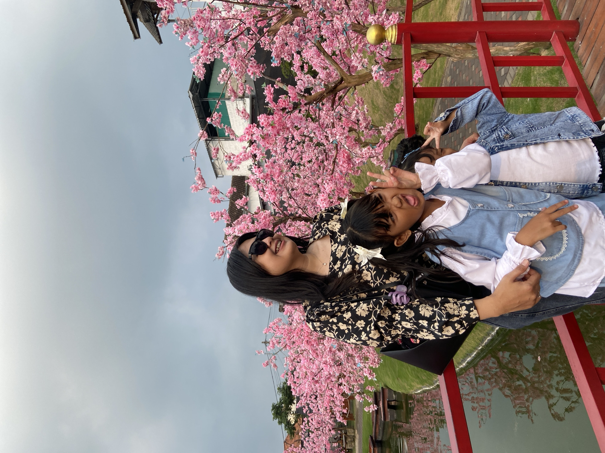 On a red painted wooden bridge in Prigen, Indonesia, a woman wearing a black and white floral patterned dress and sunglasses is holding two children. The children are wearing denim vests and white tops. One child sticks their tongue out with a peace sign, and the other is doing a peace sign. Pink cherry blossom trees are prominent in the background. Behind the trees is a white building with a black roof. The sky is overcast. Below the bridge, water reflects the bridge and trees.
