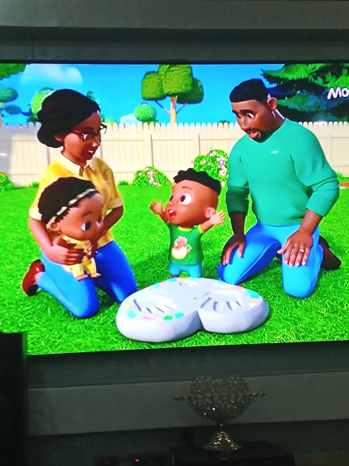 An image captures a television screen displaying an animated scene. Four animated African-American characters are depicted in a vibrant green backyard. An adult female, wearing a yellow shirt, blue pants, and glasses, kneels on the left, holding a baby in a yellow outfit. An adult male, in a green long-sleeved shirt and blue pants, with a wedding band on his left ring finger, kneels on the right, looking towards the center. Between the adults, a young boy in a green t-shirt and blue shorts stands with arms raised. In the foreground of the animated scene, a white, heart-shaped object with colorful accents rests on the grass. The background features a light-colored picket fence, green trees, and a clear blue sky. Below the television screen, a gold-toned, intricately textured heart-shaped decorative object on a pedestal is visible. The location is Unknown, Unknown.