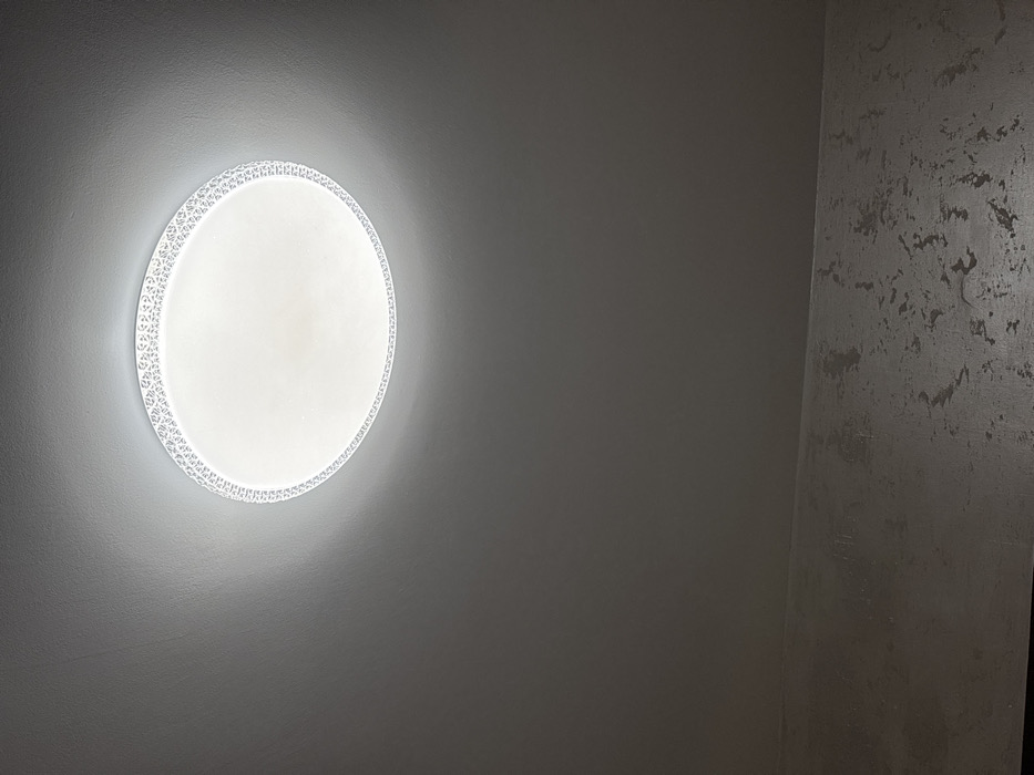 The image depicts an interior architectural space located in the city of Bukovlak, Bulgaria. A circular, surface-mounted LED light fixture is affixed to a flat, light grey ceiling, positioned in the upper-center of the frame. The fixture emits white light, illuminating the surrounding ceiling and an adjacent wall. The light fixture features a central translucent diffuser and a perimeter ring with a repeating geometric pattern. The wall, visible in the lower portion of the image, exhibits an irregular, mottled grey texture, distinct from the smoother ceiling surface. No human subjects, objects other than the fixture, or discernible actions are present.