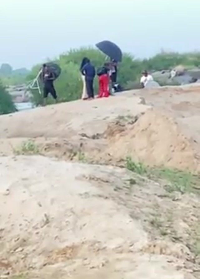 In an overcast, outdoor setting, a film or photo shoot is in progress on a sandy landscape. A group of people, likely the crew and talent, are situated on a sandy mound. Some individuals are holding a large black umbrella and a circular reflector, suggesting efforts to control lighting. A person in red pants stands near the center of the group. The surrounding environment features sparse greenery, rocks, and water, indicating a possibly remote or natural location. The camera's perspective gives a wide view of the scene, emphasizing the contrast between the human activity and the natural terrain.