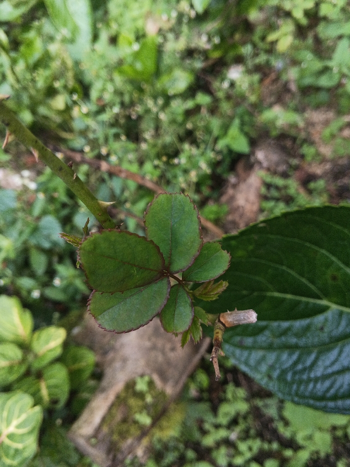 A close-up photograph displays a section of vegetation, situated in Kon Tum, Vietnam. The primary focus is a green, thorny stem, extending diagonally from the upper left towards the lower right. Attached to this stem is a cluster of three distinct, rounded green leaves, each bordered by a subtle reddish-brown margin. Smaller, nascent leaf growth or buds are visible immediately below this cluster. A segment of a larger, darker green leaf, potentially from an adjacent plant, occupies the right side of the frame. The background is out of focus, composed of diffuse green foliage, a blurred area suggesting dark earth, and a section of a moss-covered, light-colored surface or structure in the lower-middle portion of the image. No human subjects, specific actions, or interactions are present.