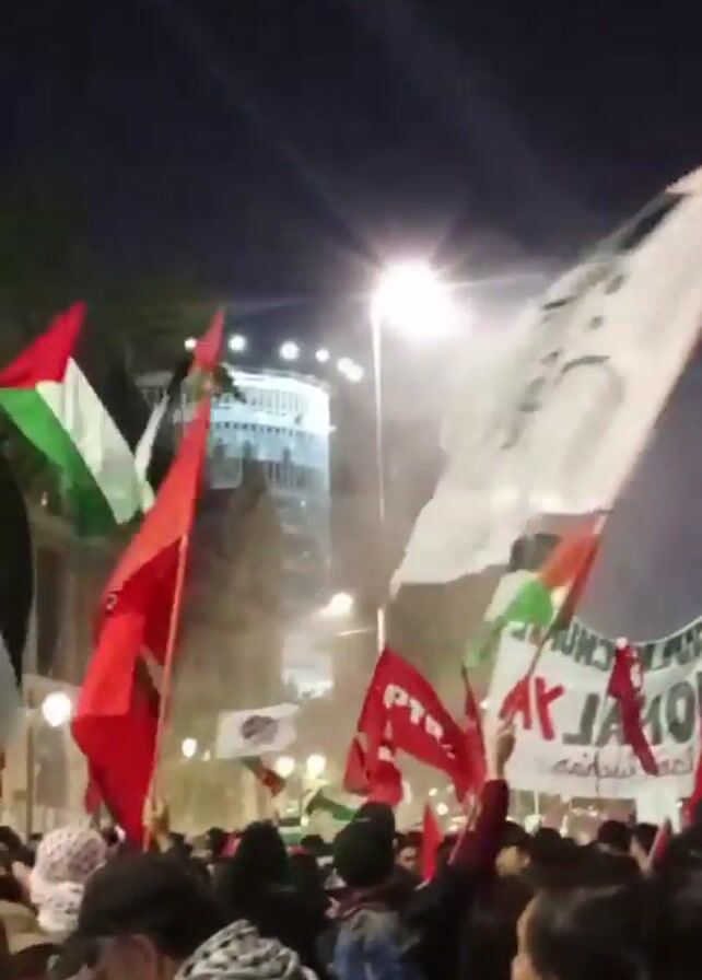 crowd of people gathered at night, waving flags and banners. Some of the flags appear to be Palestinian flags. There is also a red flag with a symbol on it. The banners have writing in a language that cannot be determined from the visual alone. The atmosphere appears to be that of a protest or rally. Streetlights illuminate the scene, and a building can be seen in the background. It is difficult to estimate the size of the crowd.