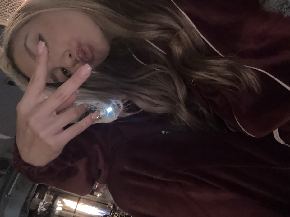 A young female with long blonde hair, wearing a dark red velour top with light piping, is positioned in the foreground, looking towards the camera with pursed lips and making a "duck face" expression