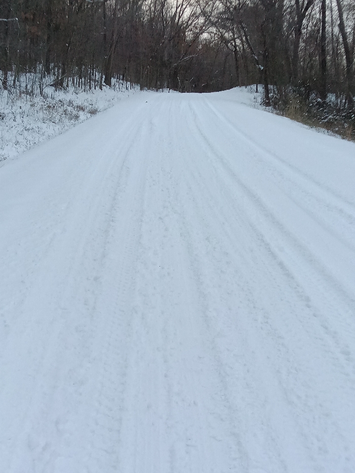 A snow-covered road stretches into the distance, flanked by bare trees and patches of snow-dusted vegetation. Tire tracks mark the road's surface, leading the eye towards a gentle curve in the path. The overcast sky casts a muted light on the scene, emphasizing the stark contrast between the white snow and the dark trees. The overall impression is one of quiet solitude and the stark beauty of a winter landscape.