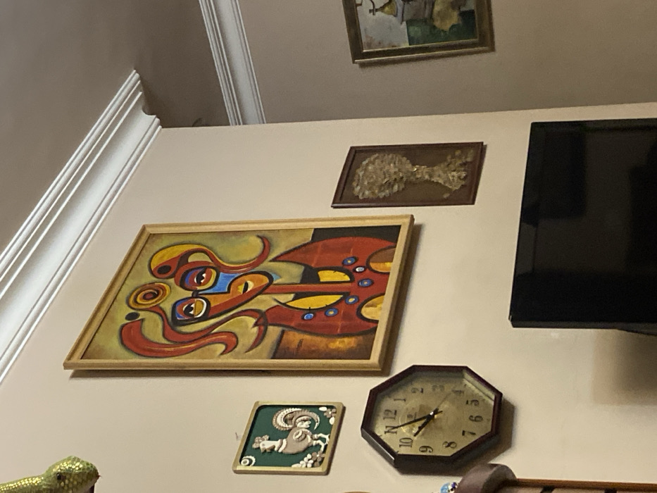 This image depicts a section of an interior room, presumed to be in Yerevan, Armenia. The scene is dominated by a beige-colored wall adorned with multiple framed artworks and a clock. Centrally positioned on the wall is a large, vertically oriented abstract painting, approximately 3:2 height-to-width ratio, enclosed in a light wooden frame. The artwork features a stylized, colorful figure, possibly a bust, rendered in a vibrant palette of red, yellow, blue, orange, and black outlines, with distinct eyes and a nose, resembling a Cubist or Expressionist style. To the left of this main painting, a smaller, square-shaped wall decor item with a green background displays a relief sculpture of a rooster in light grey or white, surrounded by floral motifs, all within a light-colored border. Below this, an octagonal wall clock with a dark brown frame and a light-colored face shows Arabic numerals and black hands indicating approximately 10:45. A small, green, textured, unidentifiable decorative object hangs partially visible from the top left corner, near the ceiling line. To the right of the central painting, a vertically oriented rectangular framed piece contains a three-dimensional or textured artwork depicting a tree, possibly constructed from light-colored natural materials such as shells or dried leaves, set against a dark background within a dark brown frame. Further to the right, on an adjacent wall forming a corner, a portion of another framed painting is visible, depicting a landscape or architectural scene with green and light tones. Below the main painting and the tree artwork, the top section of a large, black, flat-screen television is visible, suggesting its placement on a stand or unit. The walls are smooth and uniformly beige, meeting a white, ornate crown molding that runs along the ceiling line, indicating a finished interior space. No people are present in the scene, and no active interactions are depicted.