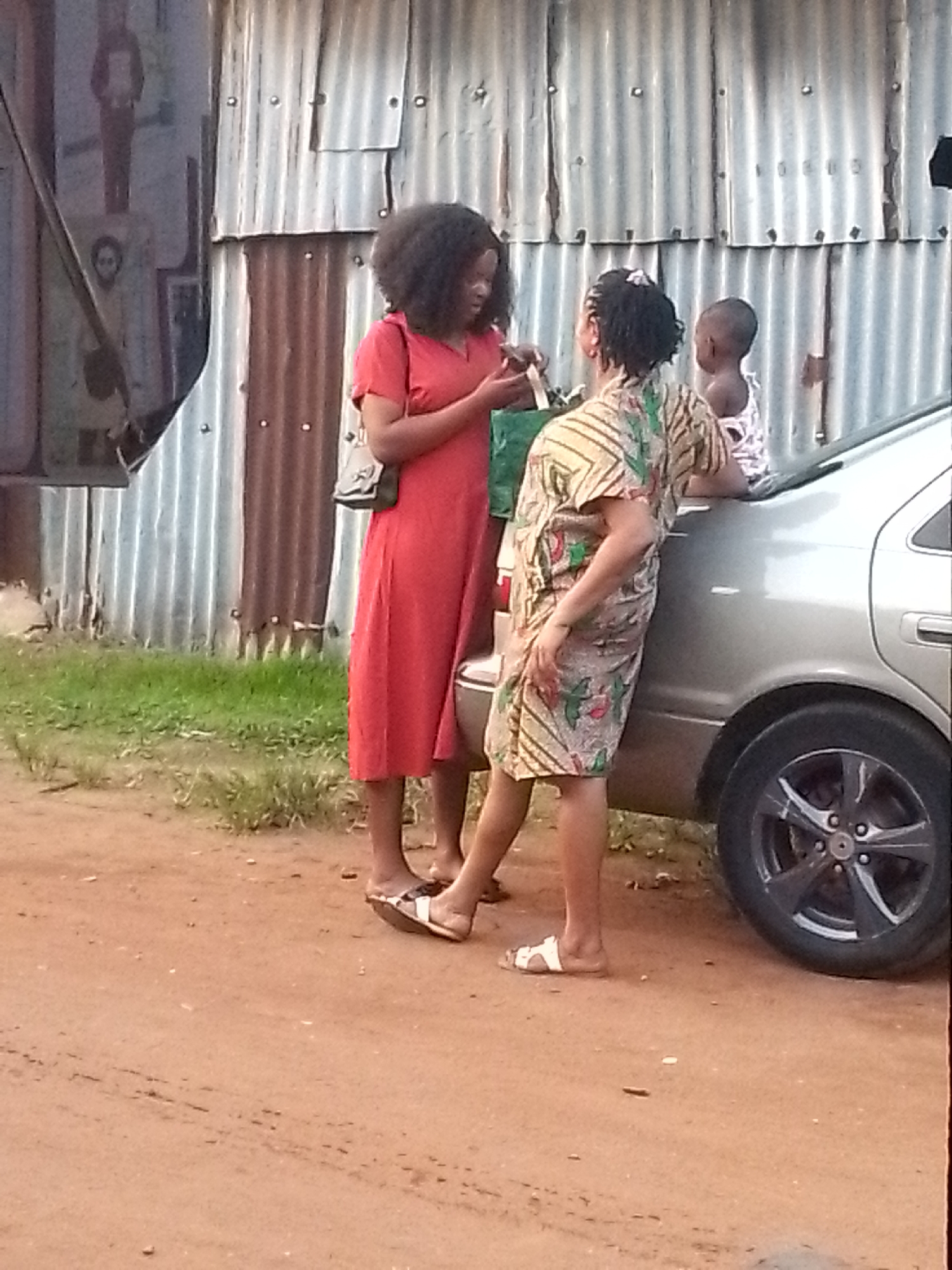 In Orlu, Nigeria, two women stand on a reddish-brown dirt surface near the rear passenger side of a silver sedan. A young child is visible standing behind the car, near the trunk. One woman is wearing a red dress and sandals, holding a green bag. The other woman wears a patterned dress and leans against the car. Behind them is a corrugated metal wall.