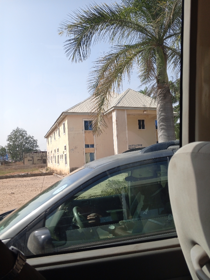 The image displays an outdoor scene in Barakin Lerawi, Nigeria, viewed from inside a vehicle. A beige vehicle seat headrest is visible on the right, while a dark element, possibly a dashboard or armrest, featuring a wrist with a watch, is on the left. In the immediate foreground, the left side of a dark-colored vehicle, likely an SUV, partially obstructs the view. Through its driver's side window, a person's hands are visible on the steering wheel, with a wristwatch present on the left wrist. In the midground, a two-story building with a faded light beige or yellow facade and a light-colored, corrugated pitched roof is central. The text "ADMINISTRATIVE BLOCK" is stenciled in black on the building's visible side. The building features multiple rectangular windows, some appearing blue-tinted. A tall palm tree with prominent green fronds stands to the right of the building, partially obscuring it. The ground in front of the building and extending to the left is unpaved, dusty, and light brown. The background consists of a clear, bright blue sky. To the far left, a smaller, single-story structure with a flat roof, appearing either unfinished or dilapidated, is visible. Another tree with a full green canopy stands further left in the background.