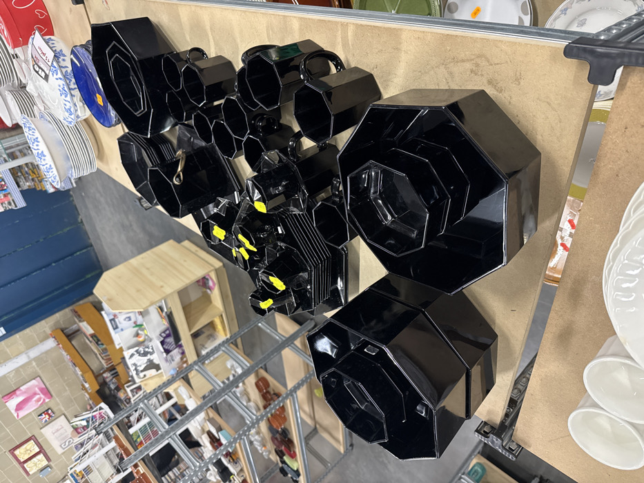 The image displays an indoor commercial environment, identified as being in Mouscron, Belgium, consistent with a thrift store or market setting. The foreground and mid-ground are dominated by a large arrangement of black, high-gloss, octagonal dishware and cups displayed on a light brown tabletop. This collection includes multiple nested sets of octagonal dishes of varying sizes, numerous octagonal mugs with handles, and at least one rectangular tray, with several items bearing yellow price tags or labels. To the upper right, stacks of white ceramic plates, some with blue decorative patterns, and plain white bowls are visible. A blue rectangular dish is situated beneath some of the stacked white plates. The background on the left reveals multi-tiered metal shelving units stocked with diverse items such as small decorative objects, possibly books or magazines, and other household goods. A light wooden display cabinet is also present. On the wall, various pieces of artwork or posters are affixed, including a pink floral print and a Union Jack flag. A large blue wall section or door is visible in the upper background. The floor appears to be a light grey concrete or industrial surface. No individuals are present in the scene, and no discernible actions or interactions are depicted.