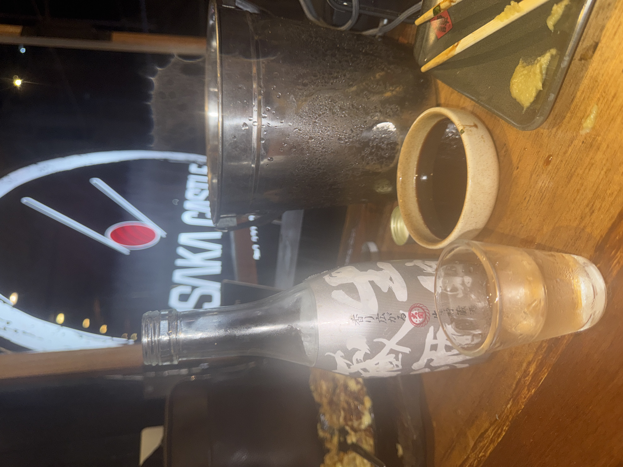 An indoor scene at what appears to be a restaurant location in El Nido, Philippines is captured. The image contains a nearly empty bottle of sake oriented horizontally, a full sake cup, a small bowl of sauce (likely soy sauce), a metallic pot covered in condensation, and a plate with wasabi, all resting on a wooden surface. In the background is a blurred light-up sign with the words "SAKA CASTLE" visible.