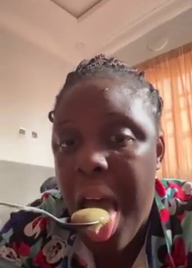 A person with braided hair is wearing a colorful button-down shirt and is eating with a spoon in what appears to be an indoor setting. The person is looking directly at the camera. A window with orange curtains is in the background. The ceiling is white with a recessed rectangular design.