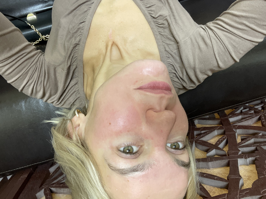An overhead-oriented image features a blonde female reclining indoors, looking directly at the camera. Her face presents with diffuse redness on the cheeks and nose. She has light green eyes and light reddish-pink lips. A small, light-colored stud earring containing a dark stone is in her right earlobe. A subtle linear scar is visible on her upper chest, inferior to the clavicle. She is dressed in a light brown, long-sleeved top with ruched detailing. A gold-colored chain and circular pendant are present near her right shoulder, positioned against a dark, smooth upholstered surface. A decorative wooden screen with interwoven geometric patterns in brown and light-brown hues occupies the bottom-left portion of the frame. The specific location within Moscow, Russia, cannot be determined from the visual evidence provided.