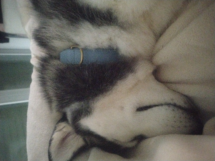 A close-up shot reveals a dog's face nestled into a soft, beige cushion. The dog's fur is a mix of white and black, with a prominent blue collar. The texture of the fur is visible. The dog appears to be resting comfortably. The focus is sharp on the dog's facial features, while the background is subtly blurred.