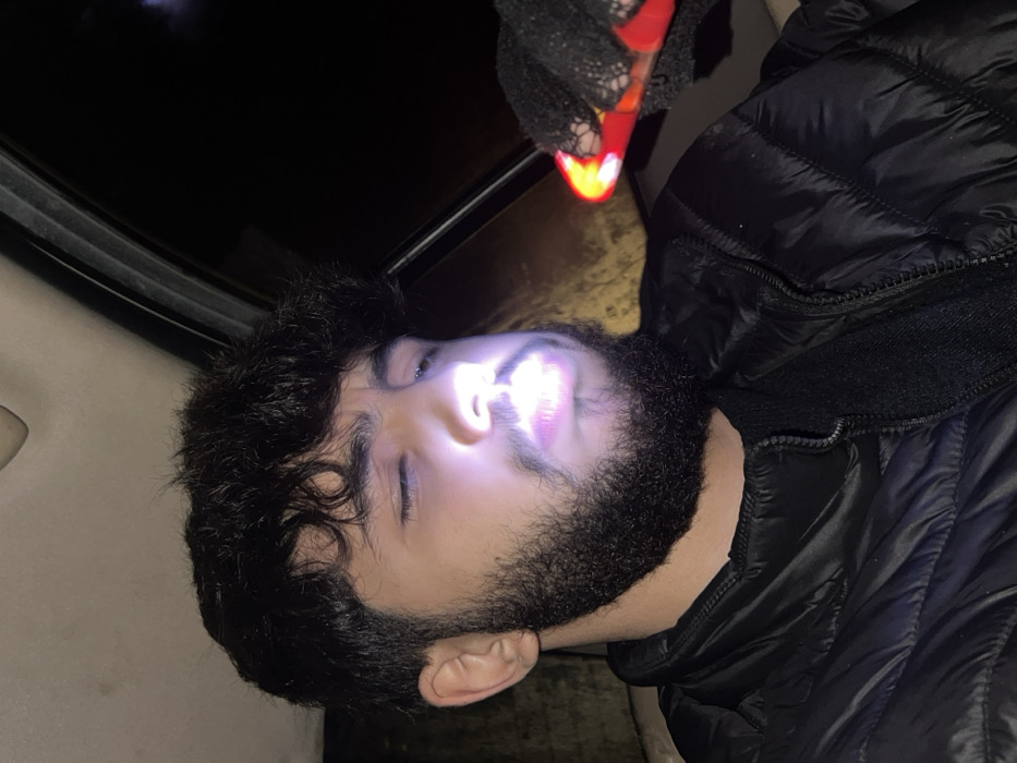 A man with a beard and dark, curly hair lies on his back in what appears to be a car. A flashlight shines directly into his face, illuminating his closed eye and mouth. He wears a black puffer jacket. A gloved hand holds the flashlight above him. A car roof is visible in the background.