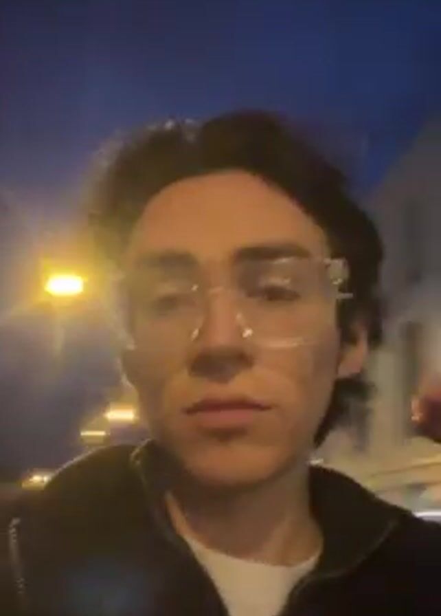 young man with dark hair and clear-framed glasses. He is wearing a black zip-up jacket over a white shirt. He is outside at night, with a dark blue sky in the background. A streetlight is visible, and cars pass in the background. The man runs his hand through his hair while looking at the camera.
