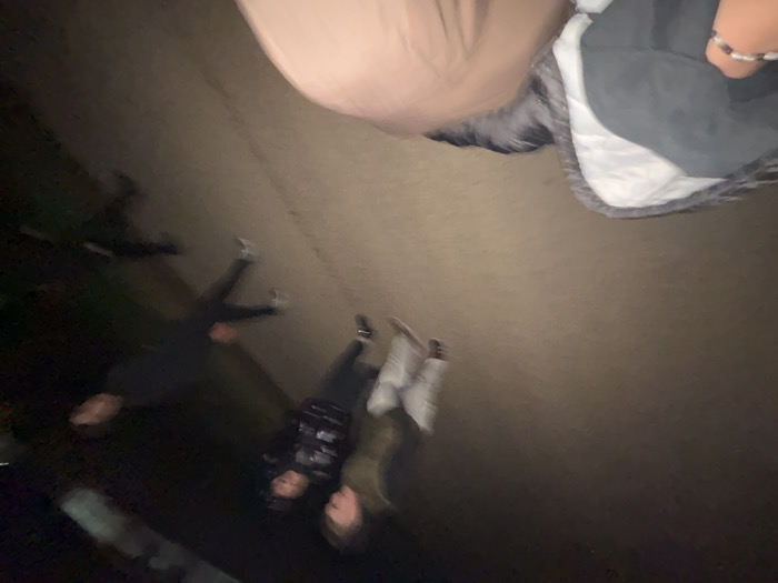 The image captures an outdoor, nighttime scene in Gromshin, Bulgaria. The perspective is low-angle, showing the photographer's lower torso and legs in the immediate foreground, clad in light brown pants and holding a grey and white jacket or hoodie. A light-colored bracelet is visible on the photographer's left wrist. In the midground, four individuals are discernible on a dark, uniform ground surface, possibly pavement or compacted earth. Three subjects are standing or in various stages of motion; one (center-right) is captured mid-action with a raised leg. A fourth individual is visible lying prone or supine on the ground further in the background. All visible subjects wear casual clothing, including dark tops, jackets, and pants. The scene is poorly illuminated, resulting in significant motion blur and a lack of detail in the indistinct background elements, which appear to be dark foliage or distant structures.