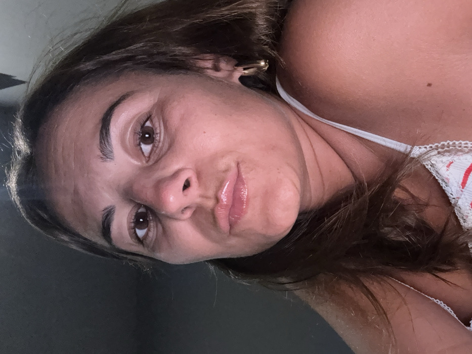 A woman with light-brown hair, fair skin, and brown eyes poses close to the camera. She has full, glossy lips and wears a delicate, white-and-red patterned top with thin straps. Her left ear is visible, adorned with a small, gold earring. A mole is noticeable on her upper chest. The background is blurred and indistinct, appearing to be a neutral gray tone. The image is well-lit, highlighting the woman's facial features.