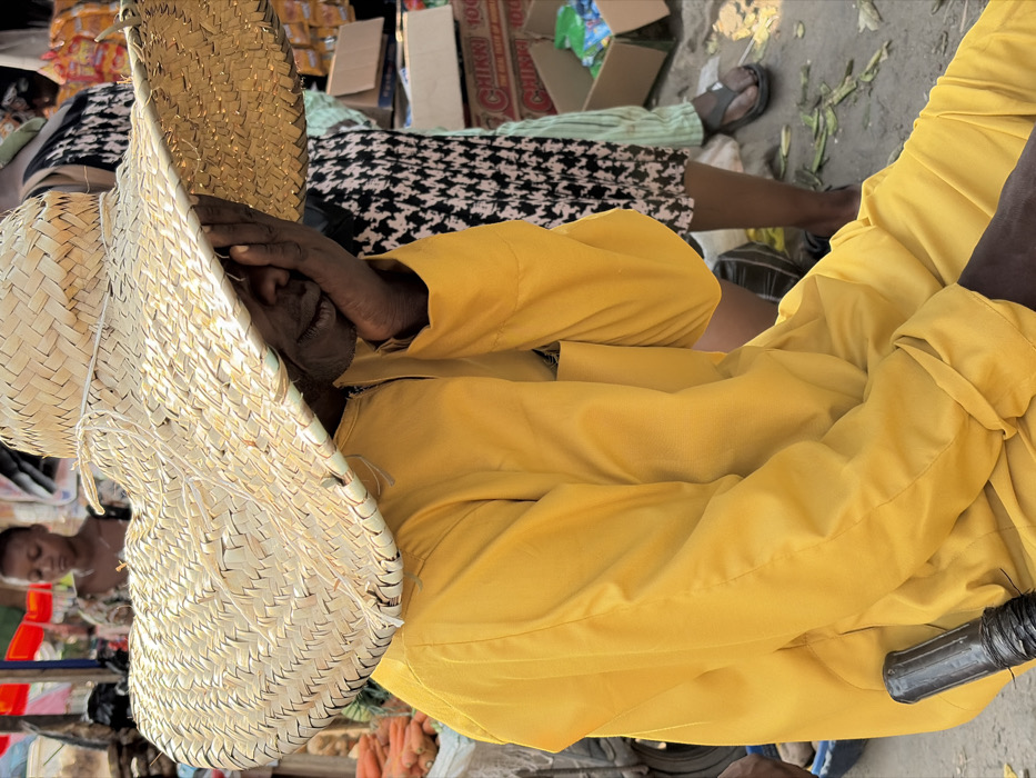 The image depicts an outdoor market scene in Jakande, Nigeria. In the foreground, a dark-skinned individual wears a bright yellow long-sleeved garment and a large, wide-brimmed woven straw hat that casts a shadow over their face. Their right hand is positioned against their cheek and jawline, partially obscuring the lower portion of their face. A dark, cylindrical object, possibly a handle wrapped with wire, rests near their left hip. In the mid-ground, to the left of the main subject, a young dark-skinned woman with dark hair and a patterned top is visible, looking towards the right. To the right, partially visible, are the legs and lower torso of another individual wearing a black and white patterned dress, light green trousers, and dark flip-flops. The background displays typical market elements: a pile of orange carrots is visible to the left. To the right, stacked cardboard boxes, some bearing the text "CHIKKI 100," contain various packaged goods, including green packages. Scattered green husks or leaves are visible on the dirt ground. Red flags or banners are present in the far background, indicating market stalls. The scene is brightly illuminated by natural daylight.