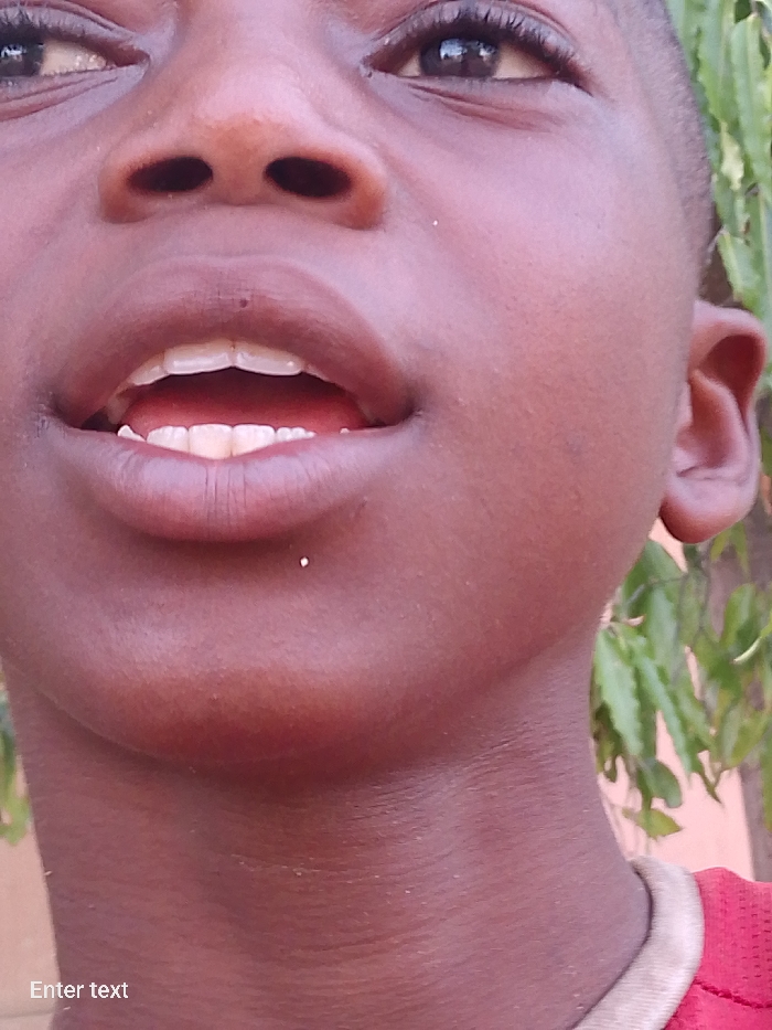 A close-up, low-angle shot focuses on a young person with dark skin. The person's eyes are directed upwards. The mouth is slightly open, revealing teeth. A small, bright spot is visible near the lower lip. Part of an ear is visible to the right. Green foliage is blurry in the background. The location is undetermined.