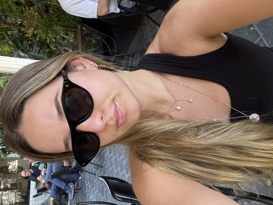 The image captures a close-up selfie of a young woman situated in an outdoor cafe in Tel Aviv, Israel. **Main Subject:** The woman, positioned in the foreground, has long, light brown hair, a clear complexion, and is wearing black cat-eye sunglasses. She is wearing a black tank top and multiple pieces of jewelry: a shorter rose-gold necklace with two small teardrop-shaped clear stones, a longer rose-gold necklace with multiple small clear stones and a circular pendant, and multiple earrings in her right ear (viewer's left), including a small hoop with colorful charms and several stud piercings. She is looking directly at the camera, indicating a self-portrait. **Environment and Background:** The scene is an outdoor dining area, characterized by dark grey interlocking paver flooring. Black metal chairs and tables are visible. Lush green foliage is present in the upper right and center-left background, suggesting trees or potted plants. A light-colored architectural column or pillar is visible on the right. In the upper left background, partial Hebrew text, including "בית" (Beit), is discernible on a sign or wall, confirming the location as Israel. **Background Individuals:** Two other individuals are visible in the background. On the left, a man wearing glasses, a dark shirt, blue jeans, and light blue sneakers is seated at a table, looking to his left. A bottle is on his table. On the right, a person wearing a white t-shirt is partially visible, seated at a table with their back mostly to the camera. **Overall Scene:** The image depicts a casual, bright outdoor cafe environment during daytime hours, with the primary subject engaging directly with the camera.